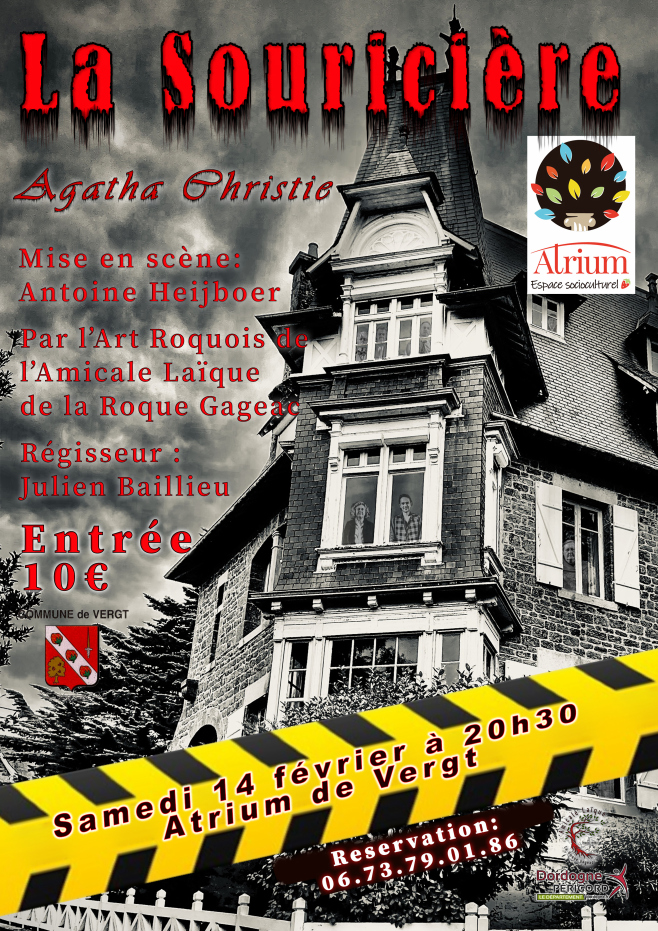 - La troupe : L’Art Roquois, rattachée à l’Amicale laïque de La Roque-Gageac, propose ce nouveau spectacle, « La Souricière », d’Agatha Christie, mis en scène par Antoine Heijboer, avec comme comédiens Franck Albert, Maurice Cattiaux, Brigitte Charpentier, Danielle Delincak, Gisèle Guillemet, Natacha Lacour, Xavier Lacoste et Maryse Minetto.