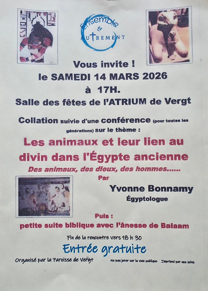 La paroisse de Vergt vous propose cette conférence gratuite d’Yvonne BONNAMY, égyptologue, qui sera précédée d’une collation puis d’une petite suite biblique avec l’ânesse de Balaam.
