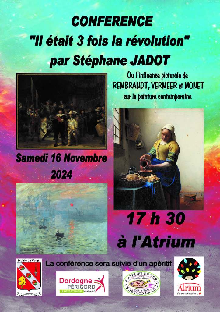 L’association AVEC (Atelier en Vergt et en couleur) a invité le peintre artiste professionnel, diplômé des beaux-arts, Stéphane JADOT pour un diaporama sur l’influence picturale de Rembrandt, Vermeer et Monet sur la peinture contemporaine. L’entrée était gratuite et la conférence a été suivie d’un apéritif. Les participants ont exprimé leur enthousiasme, soulignant la profondeur des analyses de Stéphane et l’interaction enrichissante au cours de l’événement, ce qui a renforcé leur appréciation de l’art contemporain. Vous pourrez compléter par le superbe spectacle immersif « de Vermeer à Van Gogh et Mondrian » au Bassin des Lumières à Bordeaux ! https://www.bassins-lumieres.com/fr/vermeer-van-gogh https://www.bassins-lumieres.com/fr/mondrian